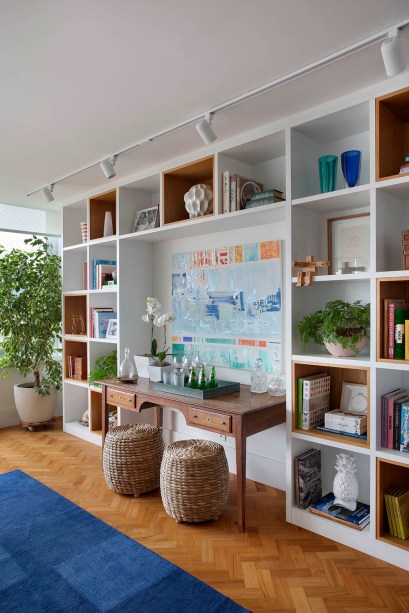 Além disso, a dupla desenhou uma estante em módulos abertos para a sala, onde são expostos livros e objetos dos moradores. Já as filhas pediram um mezanino no quarto para brincar.