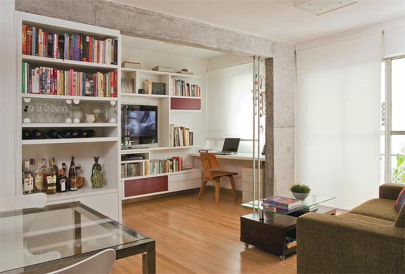 A parede entre a sala e o segundo quarto também saiu de cena. Pilar e viga ficaram à vista, assim como os conduítes que encobrem a fiação do prédio. Um armário de dupla face funciona como bar num dos lados e no outro serve à ala íntima. Confira mais fotos.