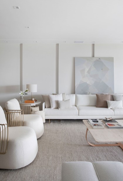 A decoração segue um estilo contemporâneo sofisticado, com toques clássicos, visualmente limpo, claro, em tons neutros e suaves, com leve toque de marcenaria para equilibrar. No que se refere à decoração, é tudo novo. A maioria das peças foi selecionada pelos arquitetos junto com a cliente, que tem um gosto muito particular.