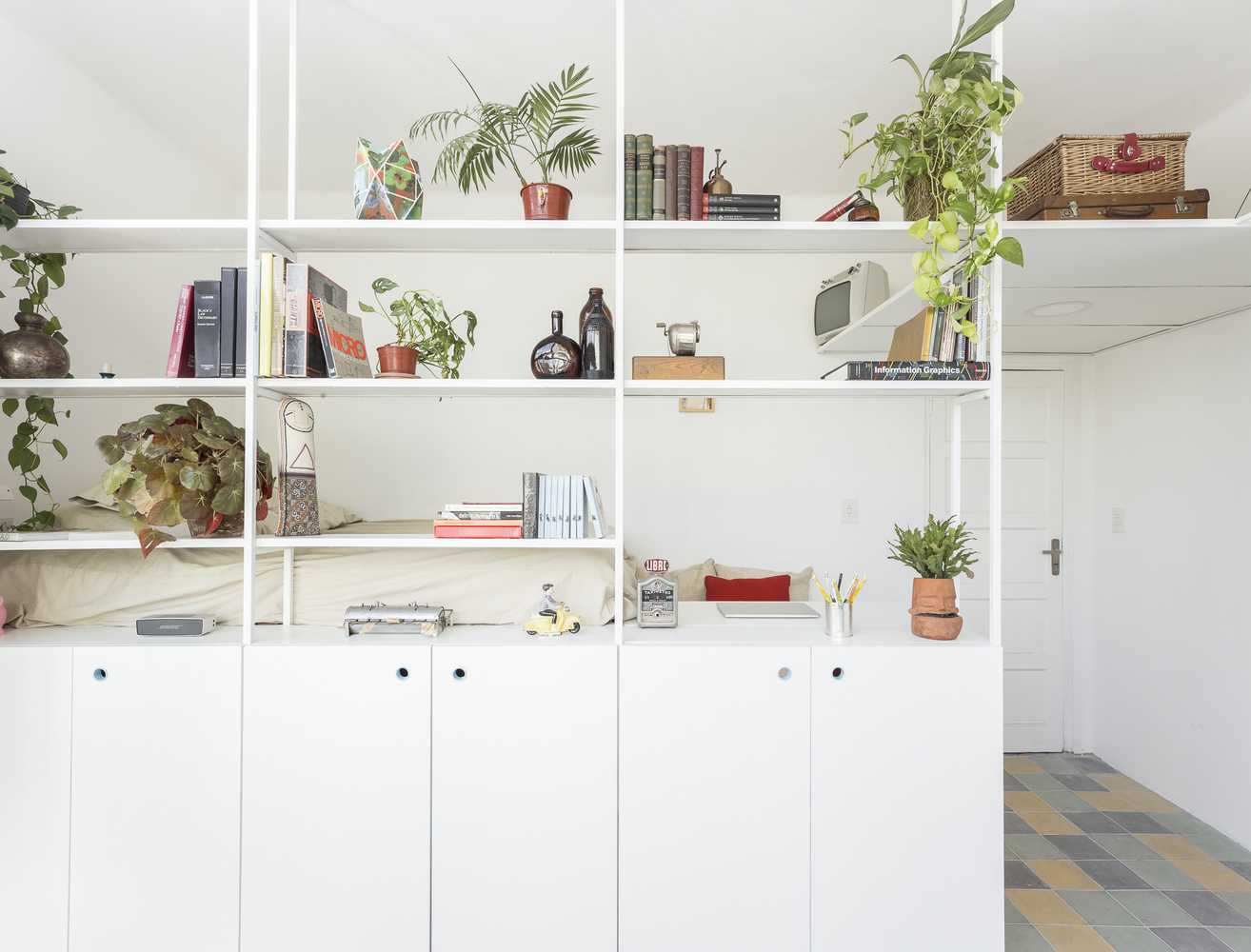 Nas duas paredes restantes, um móvel funcional abriga uma pequena cozinha, frigorífico, máquina de lavar e bastante espaço de armazenamento. No interior fica o banheiro. À sua diagonal, organizam-se a cama e o espaço de home office, que se integram ao ambiente através de uma biblioteca.