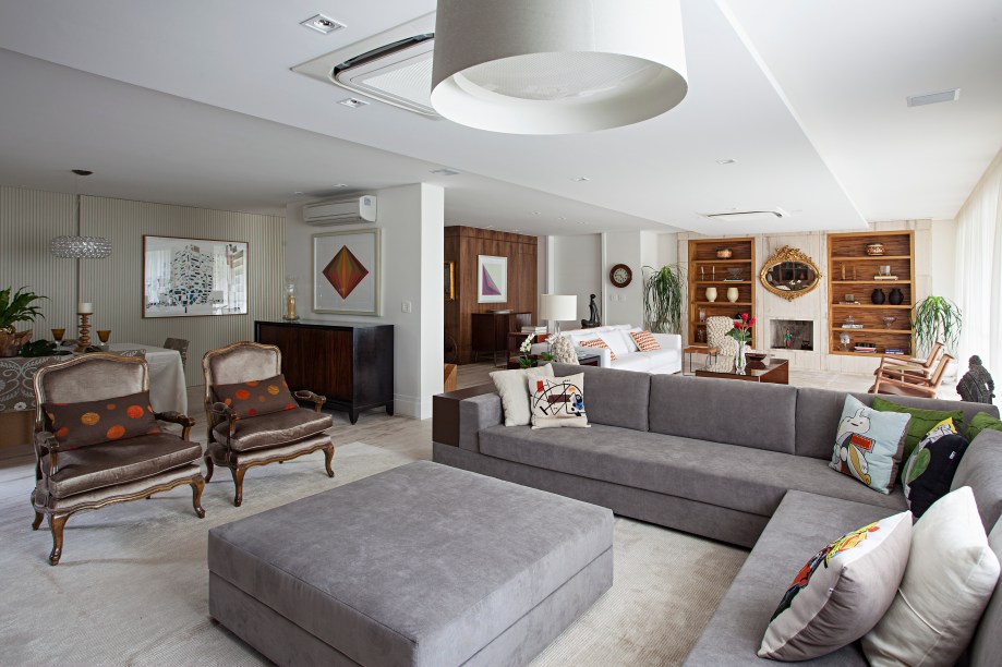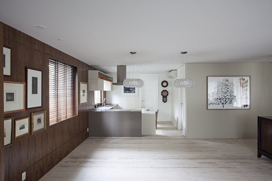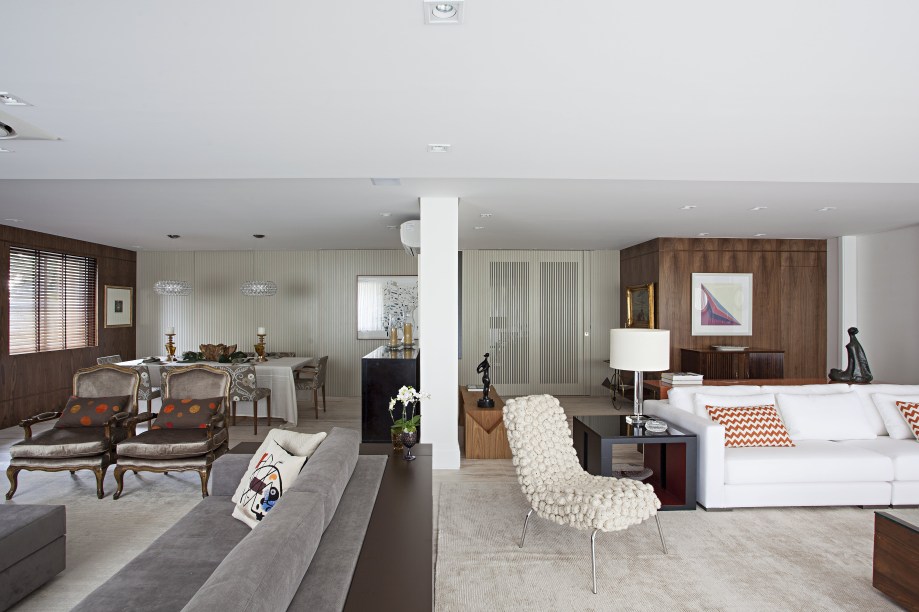 A disposição dos ambientes era um dos desafios do apartamento, pois eram todos divididos e de estilo antigo. Para dar fluidez na transição de um espaço para o outro, a arquiteta integrou hall, sala de estar, copa, cozinha, home theater e sala de jantar.
