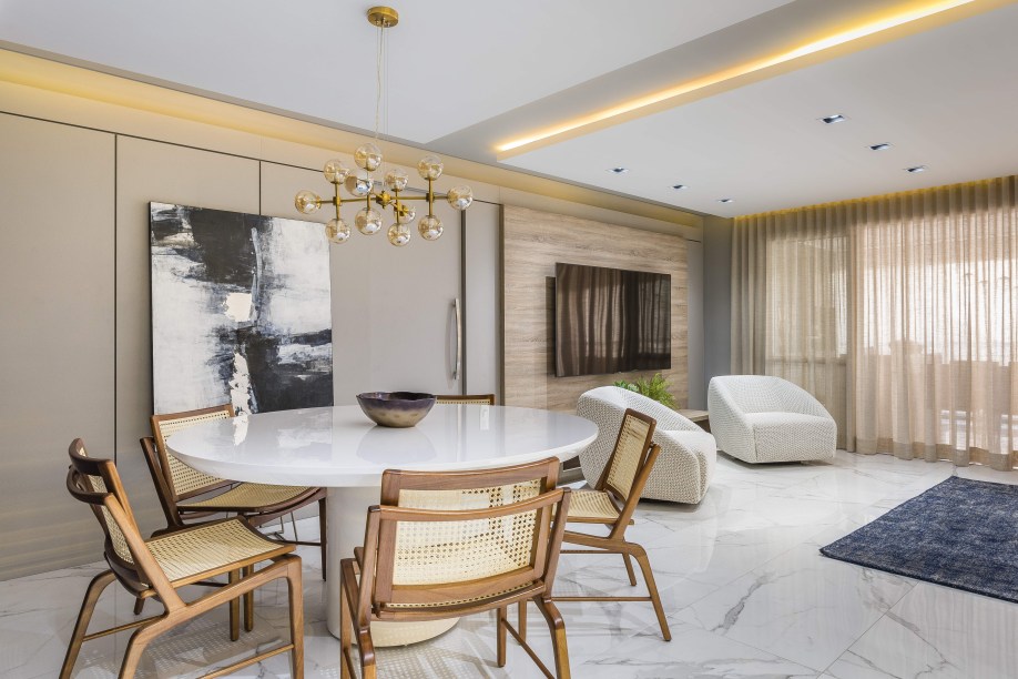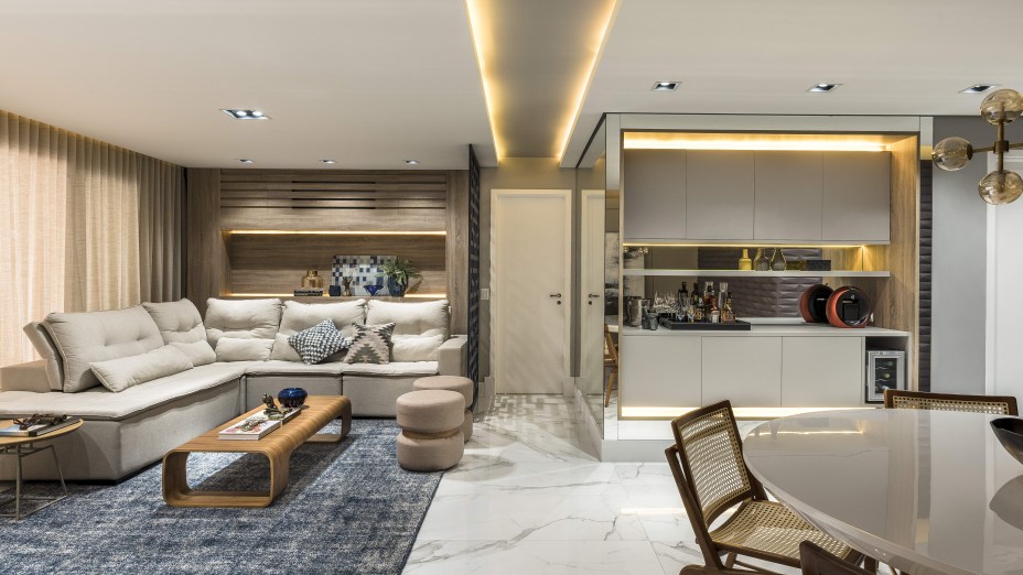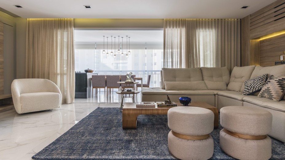 Na área de estar, um sofá em formato de L oferece mais lugares aos familiares. O ambiente fica completo com dois pufes redondos e decorativos e um painel de TV feito de madeira. Acima do sofá, o um nicho expõe itens de decoração e ripas escondem o ar-condicionado.