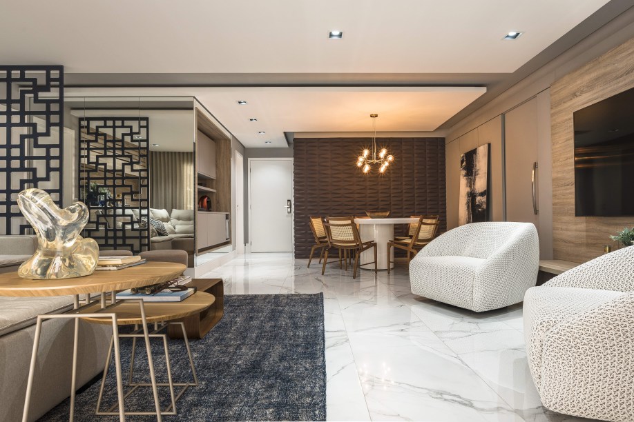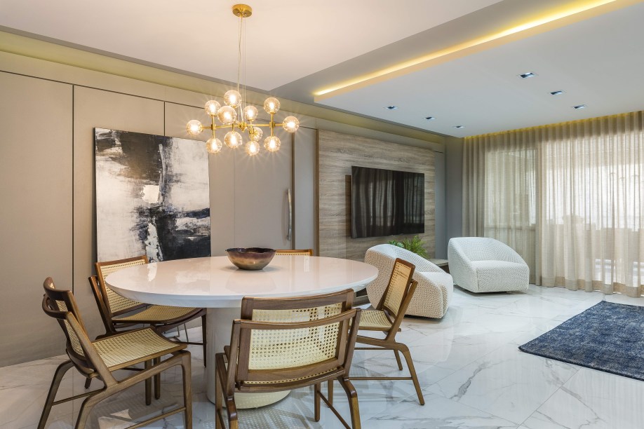 O apartamento espaçoso de 140 m² precisava ter jeitinho de casa já que era a primeira vez que o casal de proprietários estava morando em um condomínio residencial, que mais parece um clube, em Santo André, no ABC Paulista. A ideia é que a nova morada fosse ampla, fluida, confortável e pudesse receber os filhos e os netos dos moradores. Assim, a designer de interiores Daiane Antinolfi foi convocada para tocar o projeto.