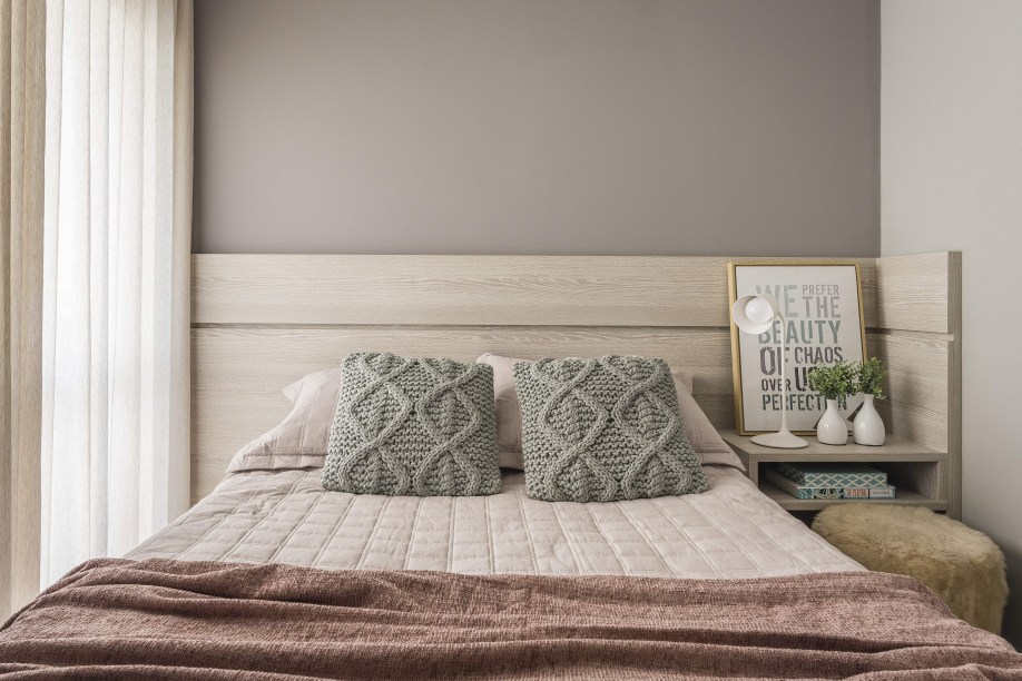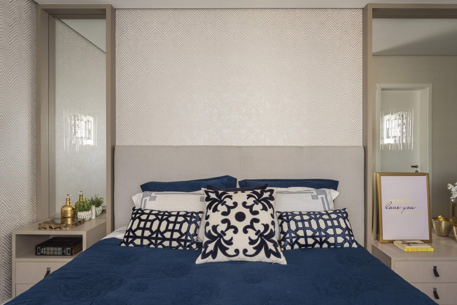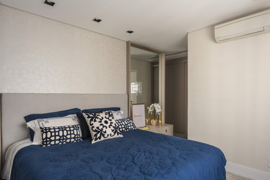 O quarto para o casal de moradores possui cama king size e muitos armários. O layout foi modificado por Daiane para conseguir aproveitar cada um dos cantinhos. Repare que o espelho fica na mesma parede do criado-mudo, ampliando o espaço.