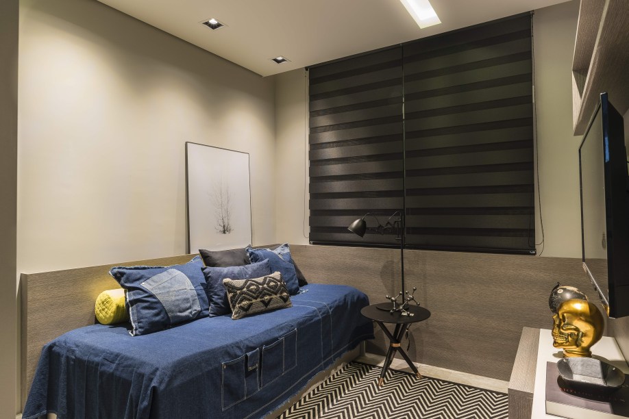 A área íntima possui três ambientes: suíte principal, quartos para crianças e um quarto de hóspedes. No espaço dedicado às crianças, uma bicama foi encostada na parede e almofadas tornaram-se encosto para os meninos deixam o ambiente juvenil. O quarto de hóspedes, decorado para a filha mais nova em mente, recebeu uma paleta de cores mais delicada, com tons de rosa.