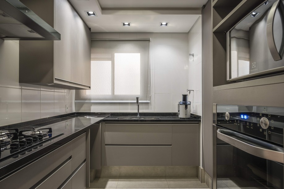 Na cozinha, o cinza predomina dando um toque de sofisticação e ao mesmo tempo de versatilidade. Todos os eletrodomésticos foram embutidos na marcenaria. O revestimento de estampa chevron em cinza chama a atenção na copa. O toque de cor ficou por conta do vermelho nas cadeiras e prateleira.