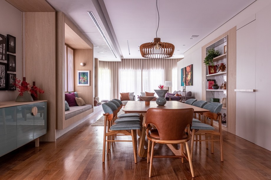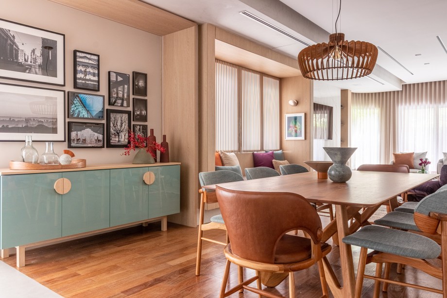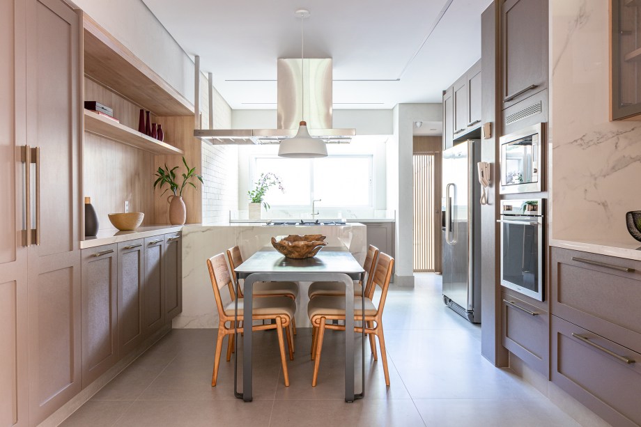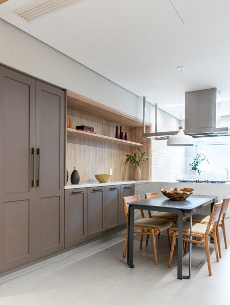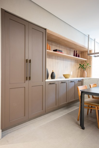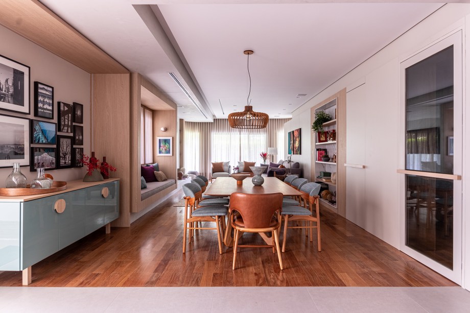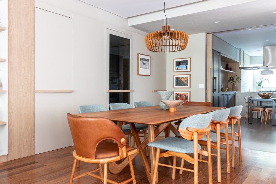Os proprietários gostam muito de madeira, por isso, a marcenaria foi muito explorada, como na cozinha separada da sala de jantar por uma porta de correr que pode ser embutida.