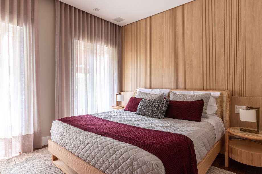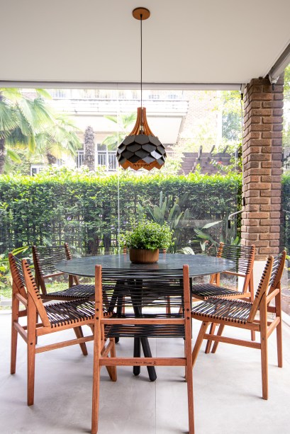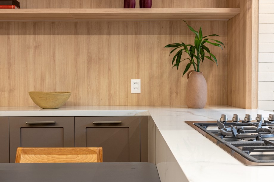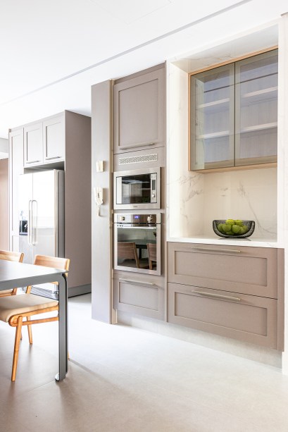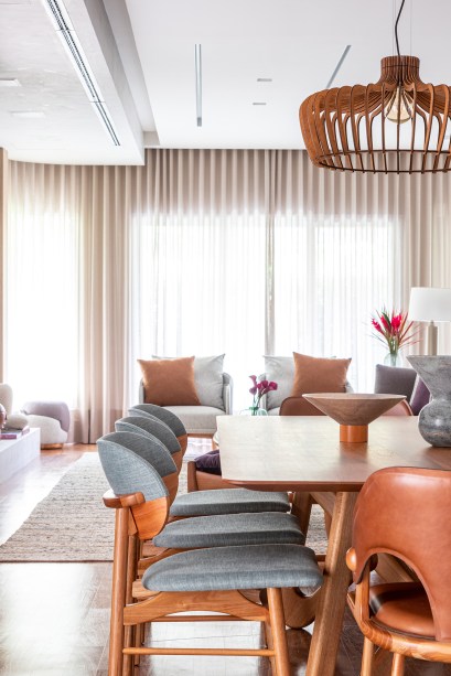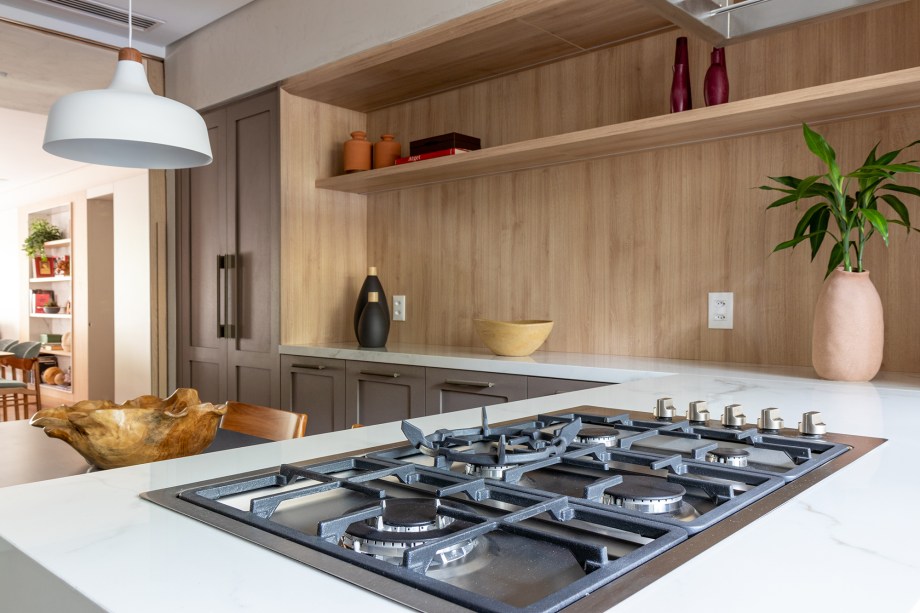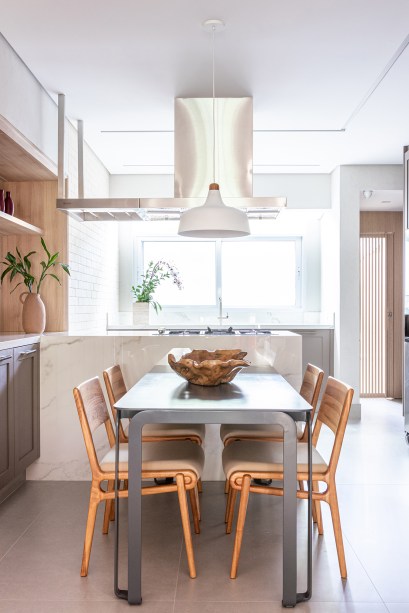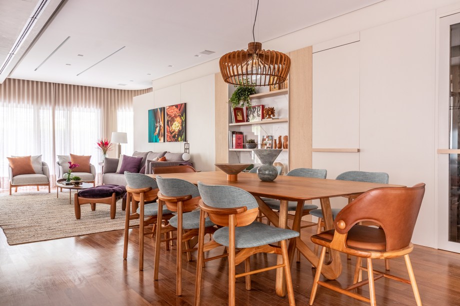 Os proprietários gostam muito de madeira, por isso, a marcenaria foi muito explorada, como na cozinha separada da sala de jantar por uma porta de correr que pode ser embutida.