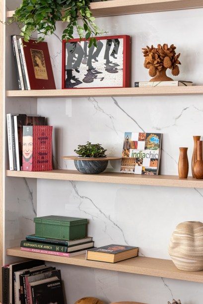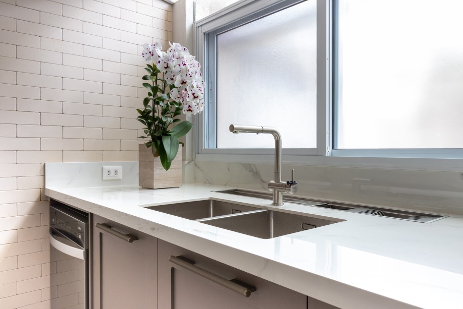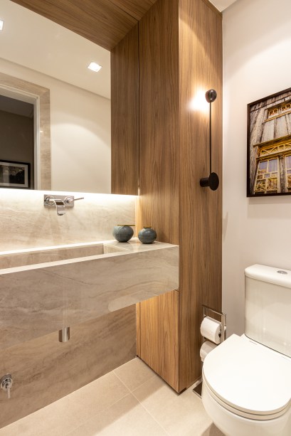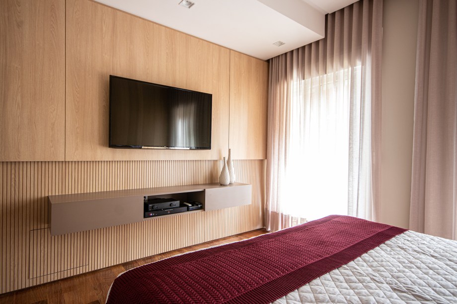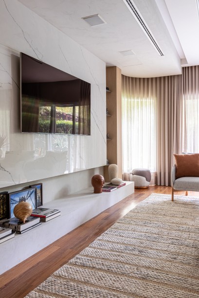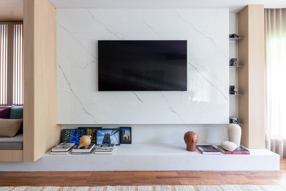 A designer conta que o espaço era bastante escuro, tinha um forro de gesso todo recortado na sala de estar e a marcenaria existente estava ultrapassada. O ponto de partida, então, foi trabalhar por um projeto mais contemporâneo, claro e funcional – o que incluiu troca de materiais, revestimentos e mobiliário.