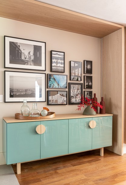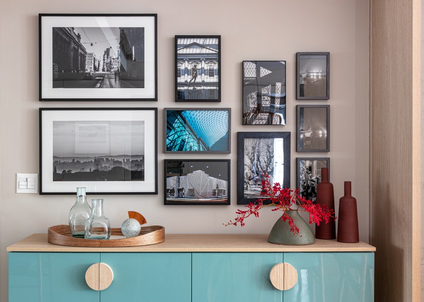 As fotos tiradas pelo morador e a marcenaria planejada dão personalidade ao projeto assinado por Marília Veiga