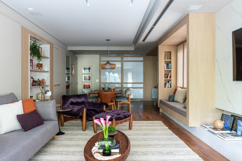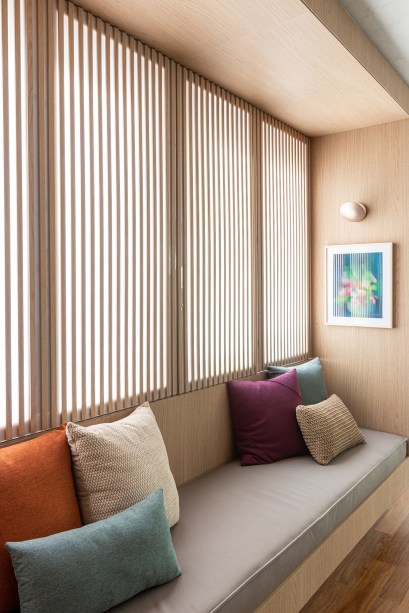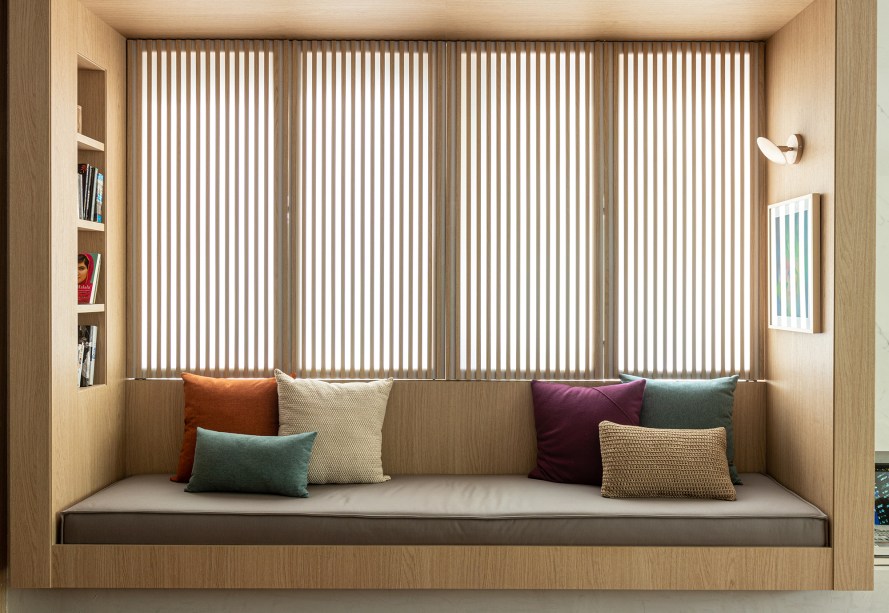 Diversos painéis também escondem portas na área social. Outro destaque é a bay window que, com futon e almofadas, virou um espaço para relaxar e ler.