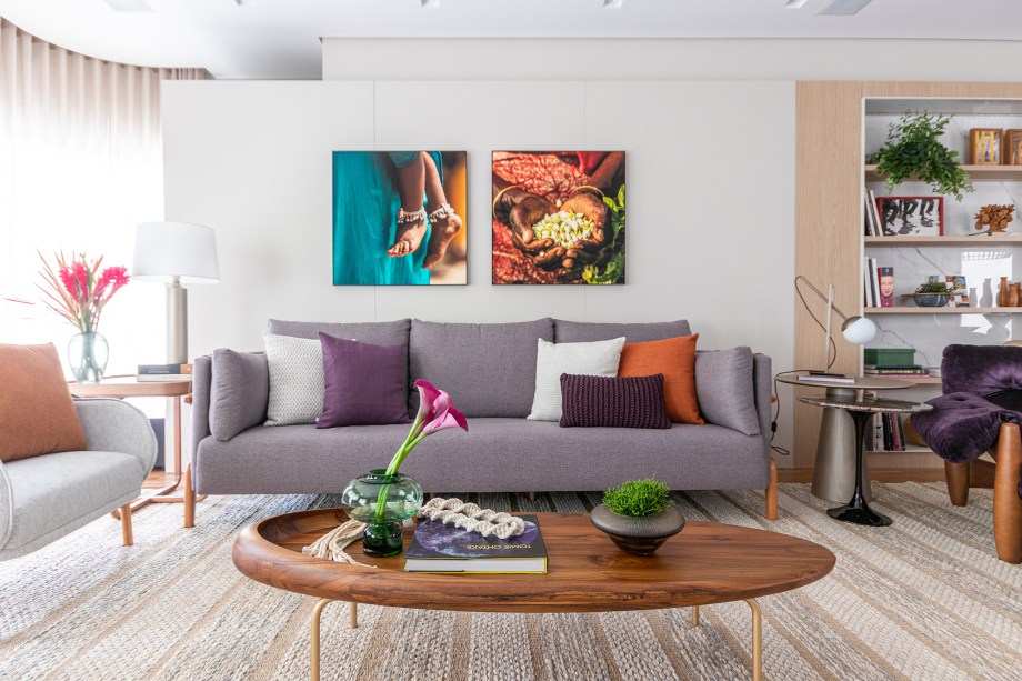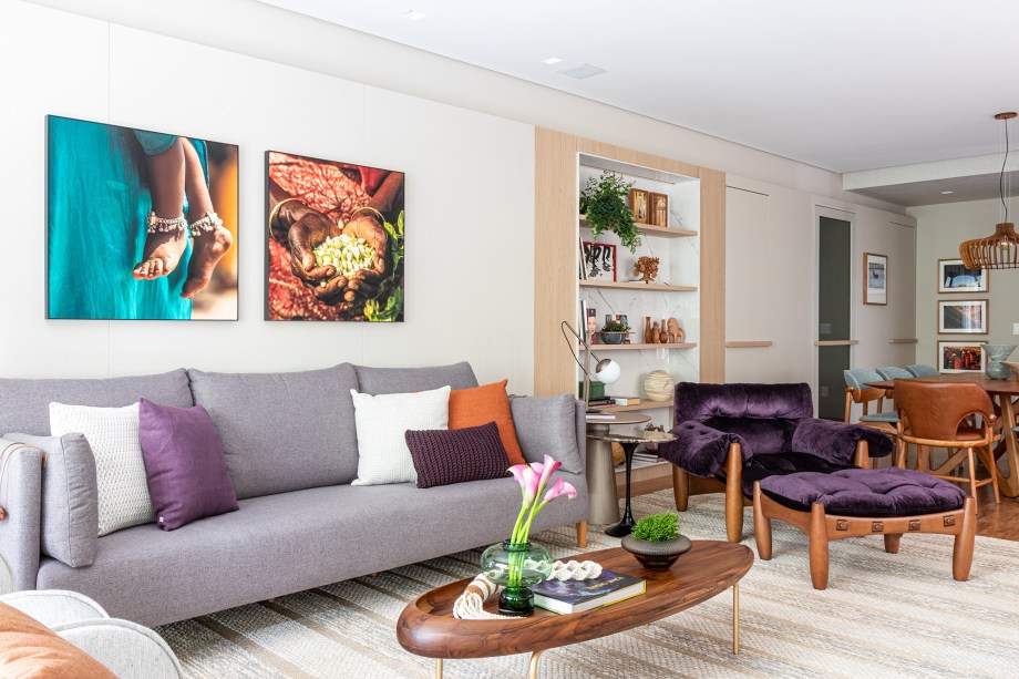 A poltrona Mole, que os moradores já tinham, foi reformada e ganhou um novo tecido em tom berinjela. A cor combina com a paleta de todo o apartamento, que segue uma base neutra, deixando o destaque das cores para objetos e itens pontuais.