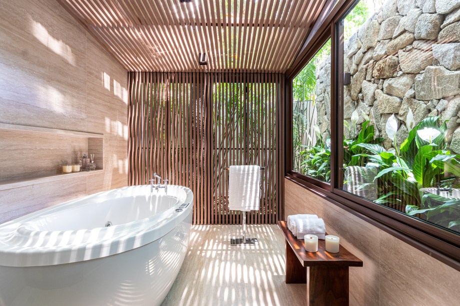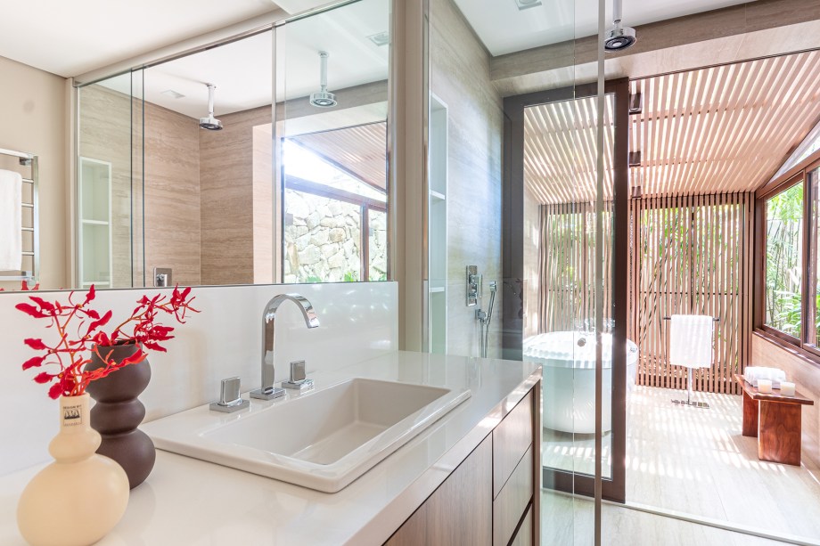 Outro grande destaque é o banheiro da suíte do casal, onde foi criado um espaço com banheira, como numa sala de banho no spa. A natureza em volta, além da grande incidência de luz natural, cria um local de descanso e relaxamento em meio à capital paulista.