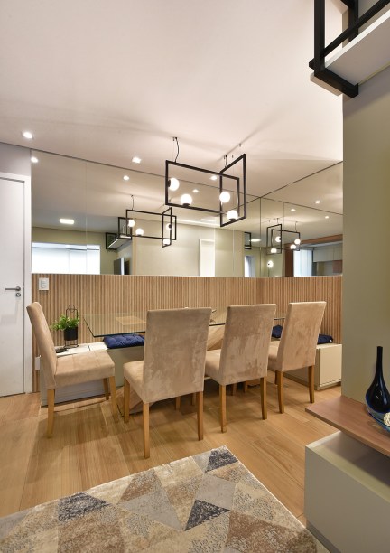 “Para ganhar amplitude, o projeto integrou toda a área social. Demolimos a parede entre a sala e cozinha, removemos a porta e nivelamos a varanda. Para intensificar a sensação de um apartamento maior, utilizamos espelhos próximo à mesa de jantar. Além disso, aumentamos o quarto do casal, transformando o segundo quarto em um closet e espaço para home office“, contou o Studio.