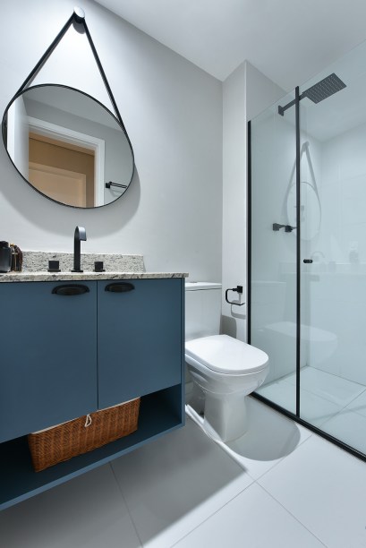 Para os banheiros, as arquitetas explicaram: “Normalmente, a reforma de um banheiro acaba encarecendo muito, então optamos por manter os revestimentos e pedras entregues pela construtora e investimos em uma marcenaria colorida e metais mais bonitos. Tudo isso deu um charme bem legal, além de diminuir o custo.”