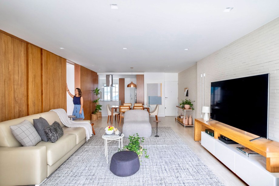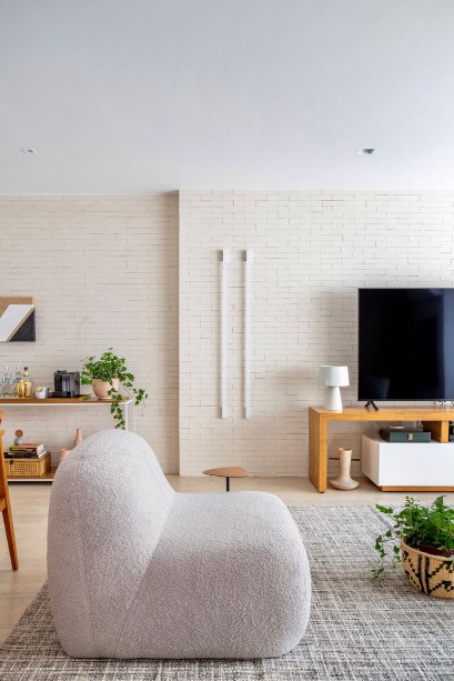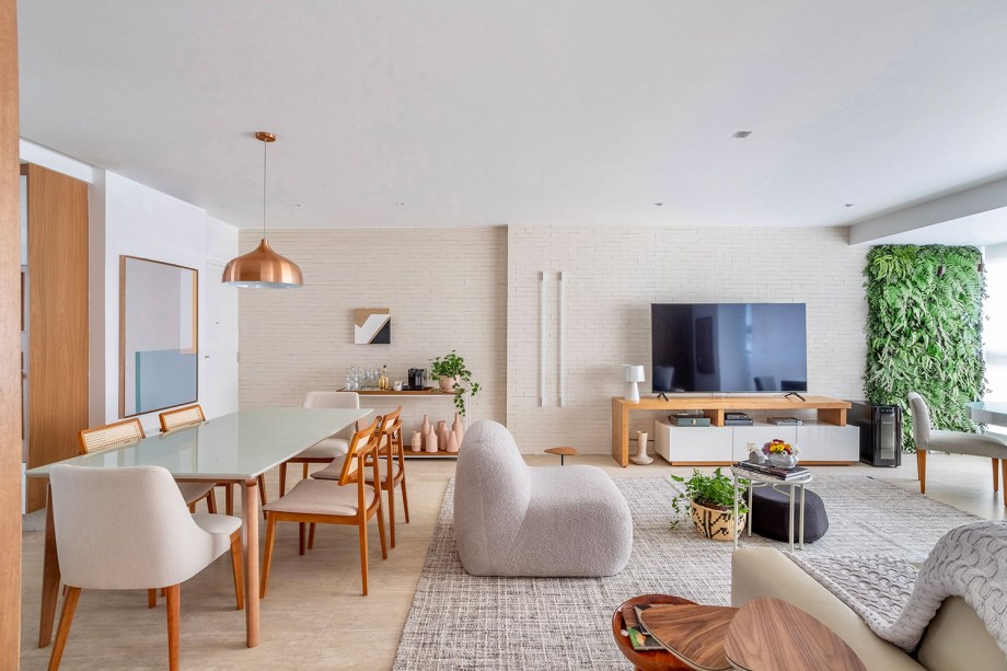 “O painel de correr executado em marcenaria ripada, por exemplo, trouxe mais aconchego à área social, fazendo contraponto à parede oposta, que foi revestida com tijolinho off white e um jardim vertical”, avalia ela.