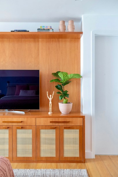 Originalmente, o apartamento tinha quatro quartos e quatro banheiros, com uma planta bastante compartimentada e ângulos indesejáveis. A arquiteta abriu um quarto para a sala e substituiu a antiga parede por um painel de marcenaria ripada, com três portas de correr, que permitem integrar ou isolar esses ambientes, de acordo com a necessidade.