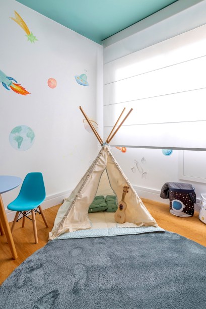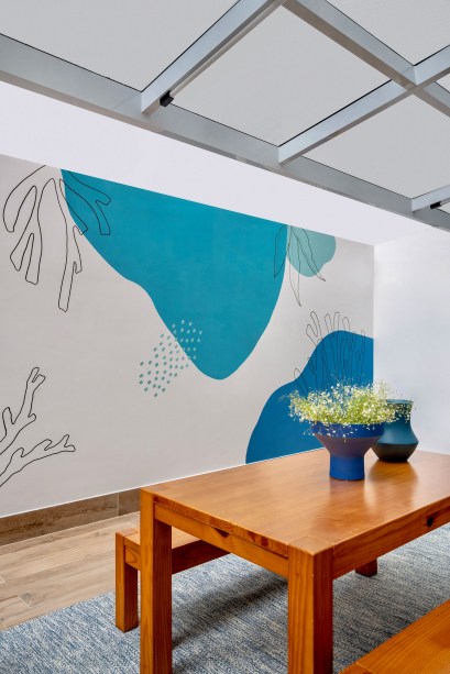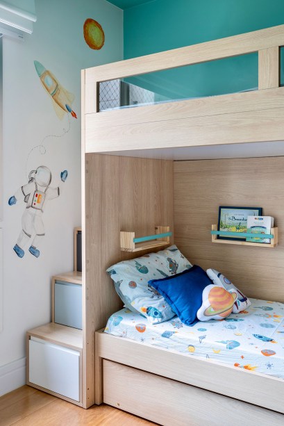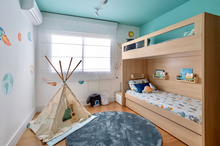 No quarto infantil vale destacar a pintura artística com tema astronauta e a cor azul aplicada tanto na parede atrás da cama beliche como no teto. A parede com pintura artística também rouba a cena na área externa, porém aqui o tema são as plantas aquáticas em tons de mar, já que a cliente adora surfar.