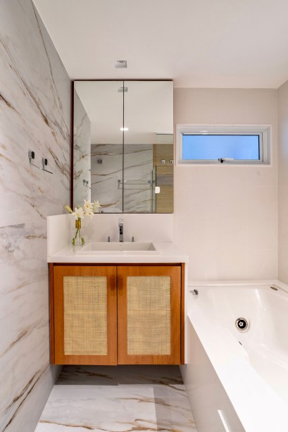 “No geral, eles falaram muito da área externa, que queriam uma bancada neste espaço para receber amigos e parentes, pediram para fechar a varanda da sala, criar um novo escritório em casa e que o quarto e o escritório existentes virassem a suíte deles, com direito a uma banheira. Ah… e que tudo isso fosse acessível ao cachorro da família”, conta a arquiteta.