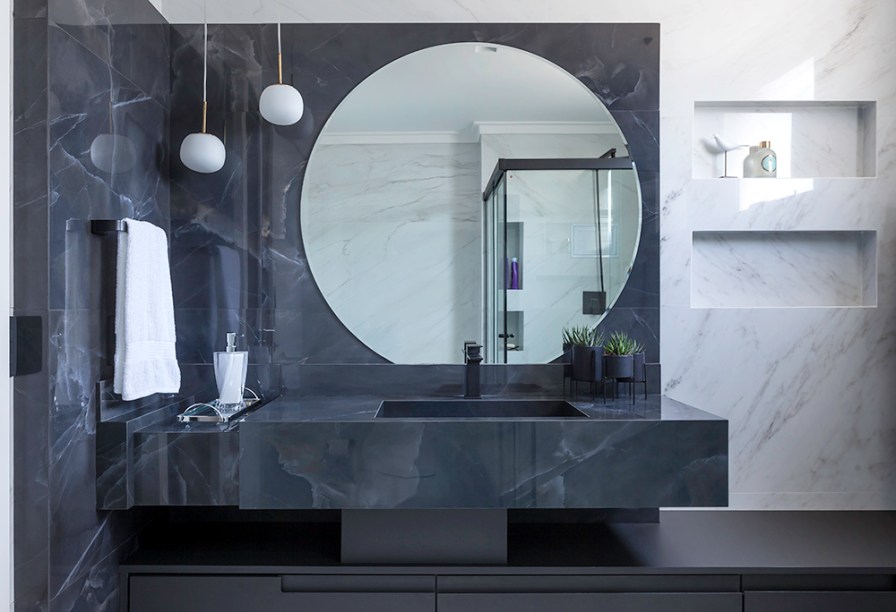O banheiro do casal foi uns dos espaços favoritos deste projeto! Segundo a arquiteta, anteriormente, os clientes contavam com um ambiente todo em mármore e ficavam frustrados com o uso de alguns produtos de limpeza que danificam os materiais com o passar dos anos. Agora, eles usufruem de uma verdadeira sala de banho sofisticada, distinta e resistente.