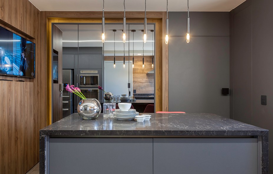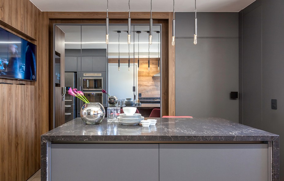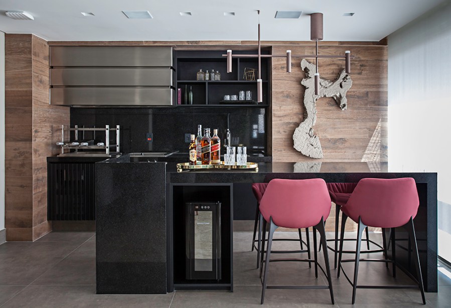 A cozinha surge como extensão da varanda gourmet, uma conexão valiosa, pensando na complementação que os ambientes exercem. “Ao mesmo tempo que está resguardada da movimentação de mais pessoas, os moradores podem preparar esses acompanhamentos do churrasco e realizar esse fluxo com muita tranquilidade”, explica a arquiteta.