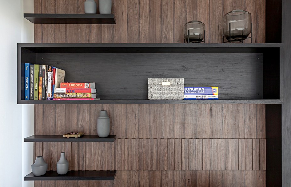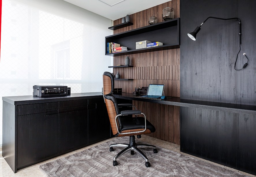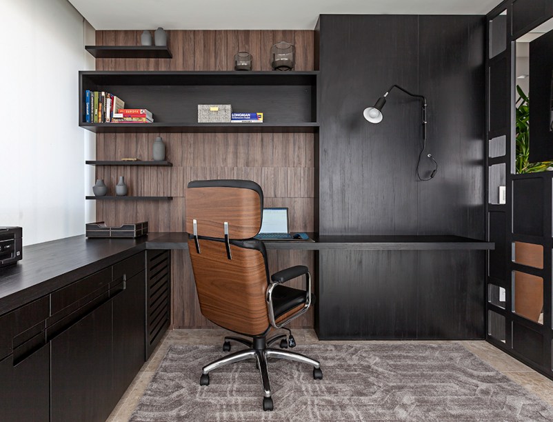O home office foi articulado onde antes era a varanda. A marcenaria foi o fio condutor para a execução dos armários, a bancada de trabalho e os painéis que revestem as paredes. E se nas áreas sociais a paleta neutra ditou o décor, a sobriedade dos tons escuros foi a tônica para o escritório – tão primordial nos dias de hoje.