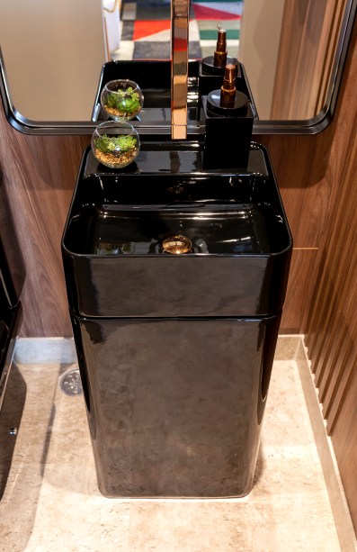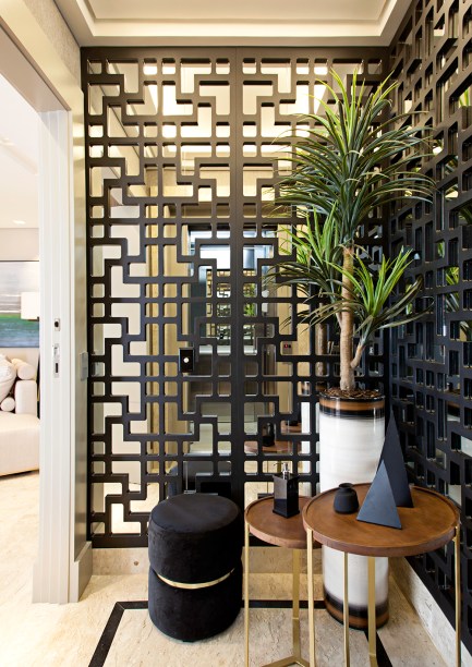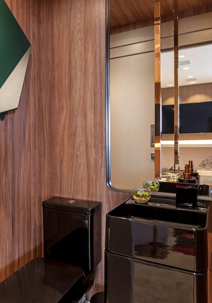 Ao assumir a reforma, a profissional definiu o que poderia ser preservado e valorizado no novo projeto. Ela manteve o piso de mármore, os espelhos existentes no hall e os armários embutidos. “Não faz sentido algum trocar por trocar. Como profissional, nosso olhar deve trazer novos contextos para aquilo que já existe e que pode integrar uma nova história. Muitas vezes, tudo é questão de trazer uma roupagem diferente e que atenda o que é esperado”, revela Cristiane.