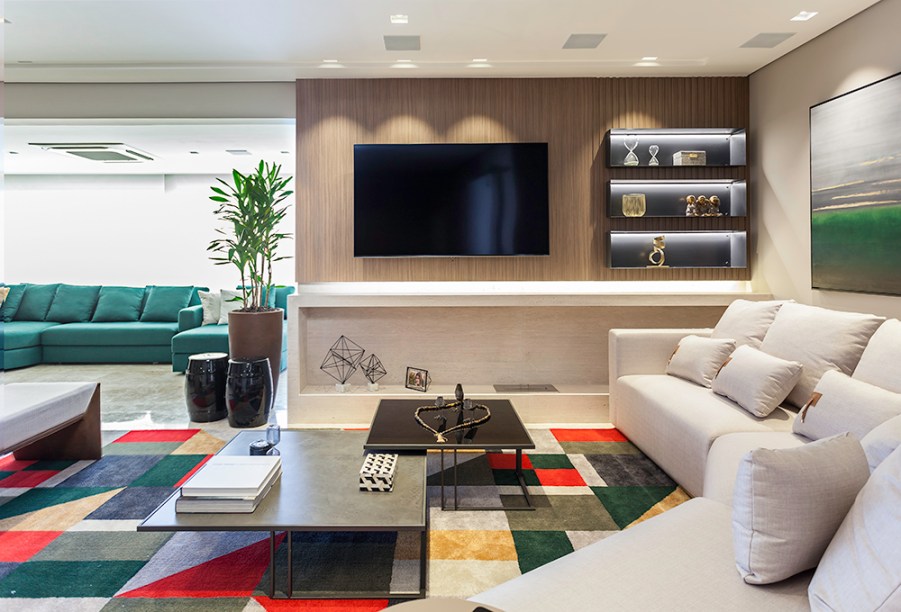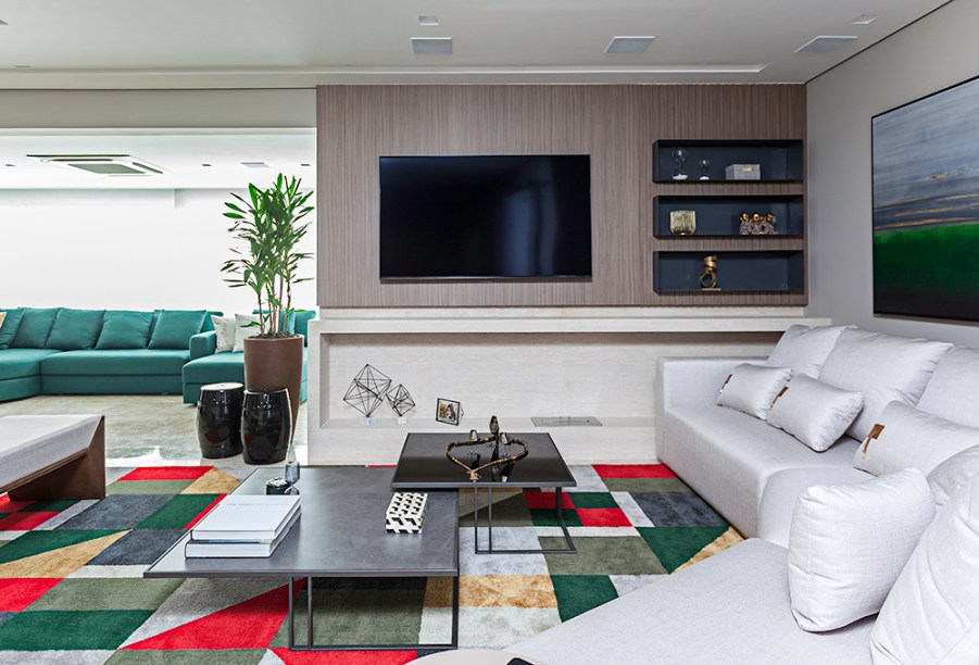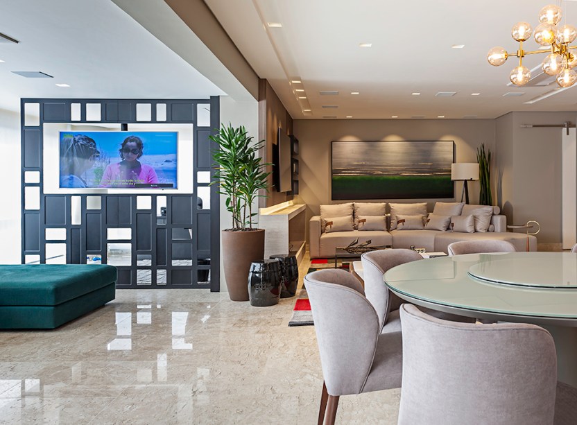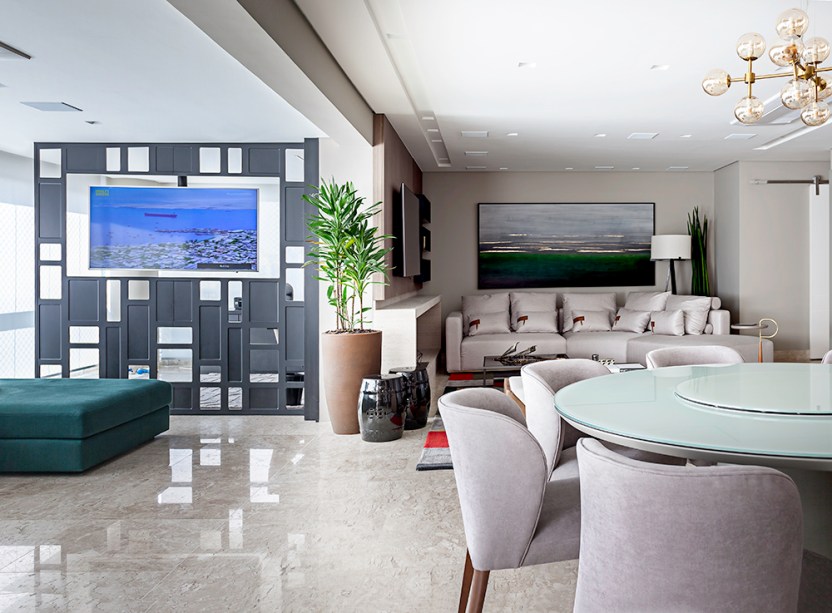 Também foi incorporado um painel vazado que cumpriu duas funções: além de preservar o home office, o vão recebeu o suporte giratório para a TV, que pode ter sua face direcionada para os dois ambientes.