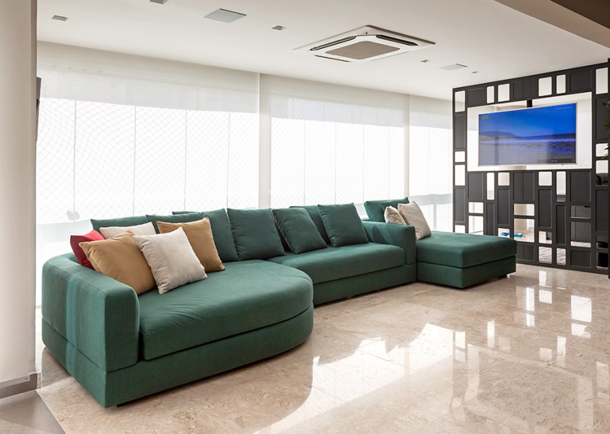 A sala de estar ganhou um novo layout, mais integrado, contando com jantar, uma área gourmet (com direito a um balcão desenhado exclusivamente para o projeto), com direito à churrasqueira, e um discreto home office para as atividades profissionais do morador. No living, o amplo sofá verde musgo, que agrega uma deliciosa estrutura de chaise, protagoniza o ambiente.