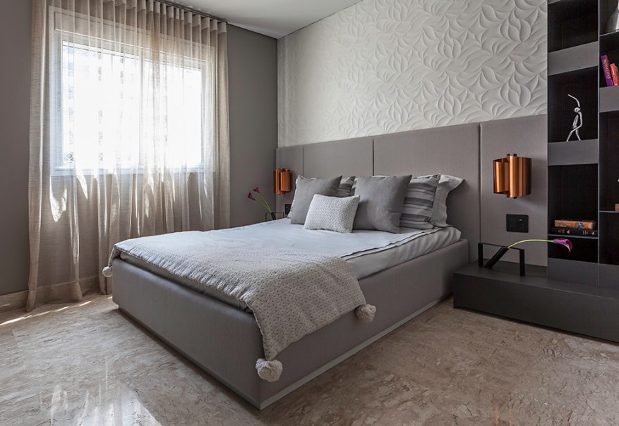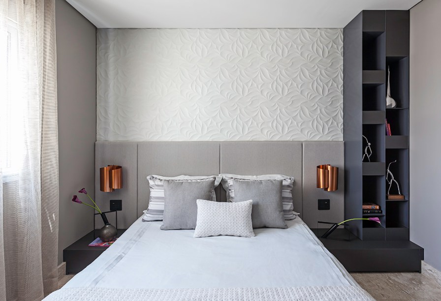 Avançando para a ala íntima, o dormitório do casal traz uma atmosfera discreta e, ao mesmo tempo, muito primorosa. Na parede principal, a profissional substituiu o antigo papel de parede com uma mescla entre o revestimento cerâmico, com efeito 3D de pétalas, que foram elegantemente combinados com a cabeceira estofada.