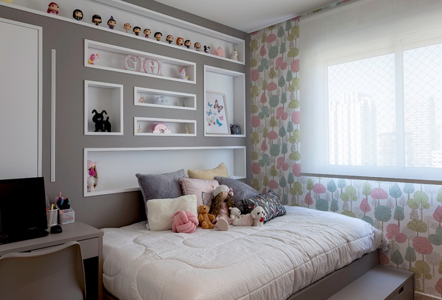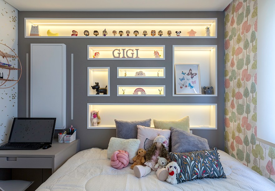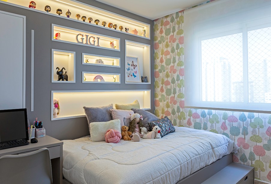 Para o dormitório da pequena Gigi, o projeto precisava ser do jeitinho que ela queria: delicado, espaçoso para receber amigas, confortável para estudar, mas que também a acompanhasse em todas as etapas de seu crescimento. A multifuncionalidade da marcenaria foi o segredinho para Cristiane executar toda a estrutura: a execução da cama com gavetões que guardam as roupas de cama, os nichos assimétricos iluminados com LED e a escrivaninha para as tarefas online.