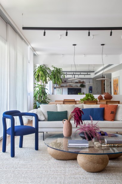 As cores aparecem de forma pontual nos adornos, obras de arte e em algumas peças de mobiliário, como a poltrona dos anos 50, assinada por Zanine Caldas (estofada em tecido terracota), e a cadeira Tubo (estofada em tecido azul bic), assinada por Guilherme Wentz.