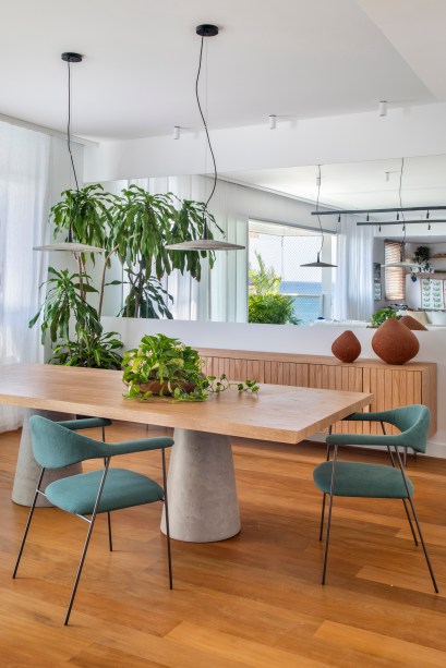 Para esta missão, entraram em cena as arquitetas Carolina Escada e Patricia Landau, do escritório Escala Arquitetura. “Os clientes queriam uma cozinha integrada à sala, espaços funcionais e acolhedores para receber amigos e familiares, uma suíte de casal ampla e dois quartos confortáveis para as crianças”, conta Patricia.