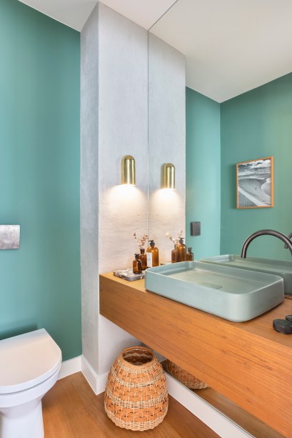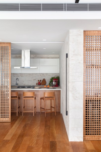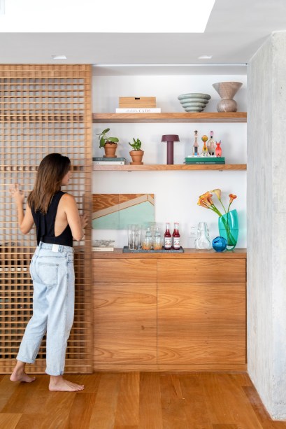 Outro destaque no projeto são as portas de correr de madeira vazada, que lembram muxarabis, instaladas entre a sala e a cozinha. “São elementos robustos e de grande impacto que oferecem a opção de isolar os espaços, sem vedar totalmente. Usamos o mesmo recurso na frente da estante da sala como solução para camuflar duas mini adegas”, finaliza a arquiteta Patricia Landau.