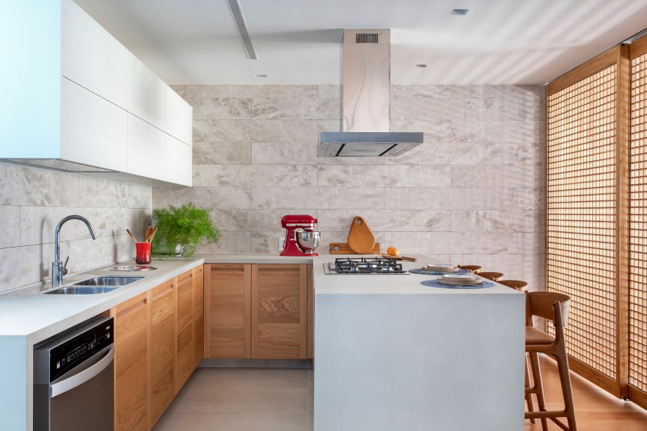 No quesito “paleta de cores, materiais e acabamentos”, as arquitetas apostaram em uma base neutra, composta por paredes claras e materiais naturais, como madeira, granito bruto, algodão, linho, couro, fibra e concreto. “Revestimos as paredes da cozinha com réguas de granito rústico e estendemos o material até a sala”, informa Carolina.