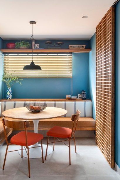 Apê de 190m² ganha área de copa com parede azul e cadeiras alaranjadas