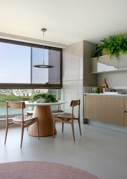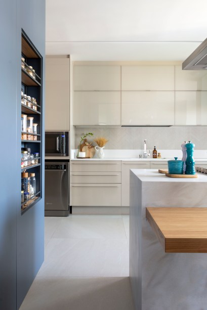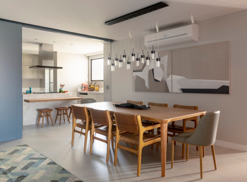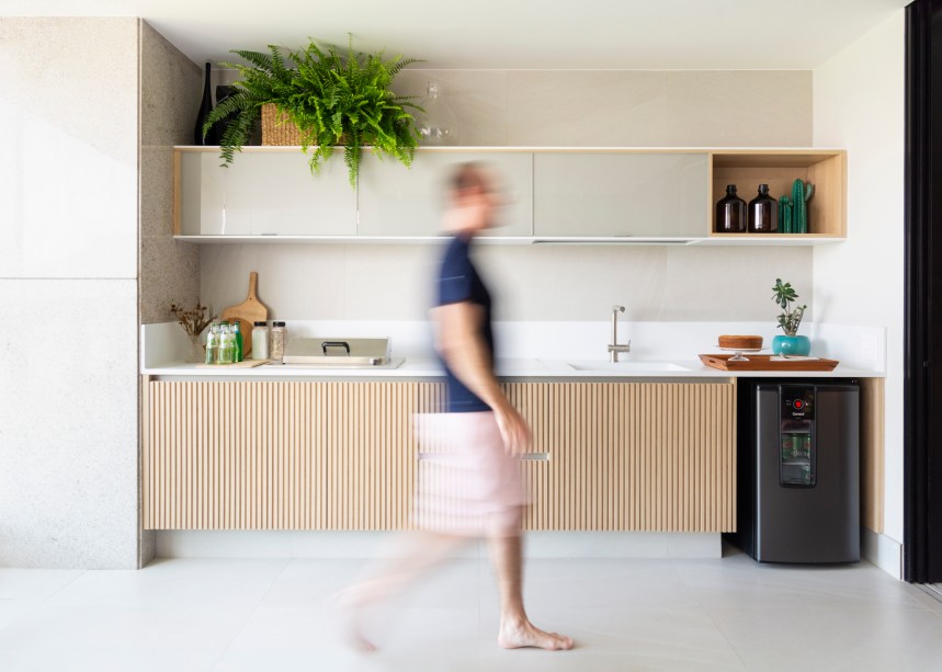 A arquiteta Paula Müller apostou no contraste entre os tons da marcenaria e pontos azuis, presentes no painel em laca e nos ladrilhos hidráulicos da varanda