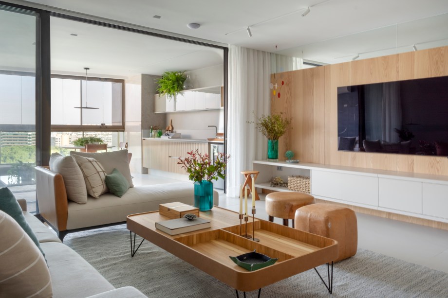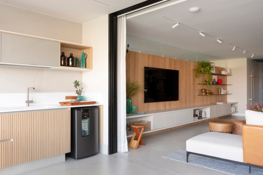 A parte superior da estante da sala ganhou uma faixa de espelho em toda a sua extensão para deixar o ambiente mais leve e iluminado. “Usamos o mesmo piso de porcelanato cinza claro, com formato grande, na área social, cozinha e varanda, não só para criar uma unidade visual como também para aumentar a sensação de amplitude”, justifica Paula.