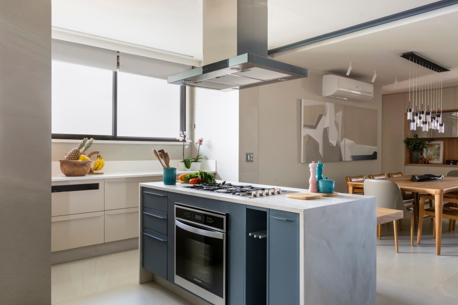 “Eles queriam eliminar o banheiro de uma das suítes para ampliar a suíte deles, integrar a sala com a cozinha e instalar uma ilha nela. Também pediram para usar azul na decoração, um escritório para ele e um escritório menor para ela, que pudesse ser usado também como quarto de hóspedes”, conta Paula.