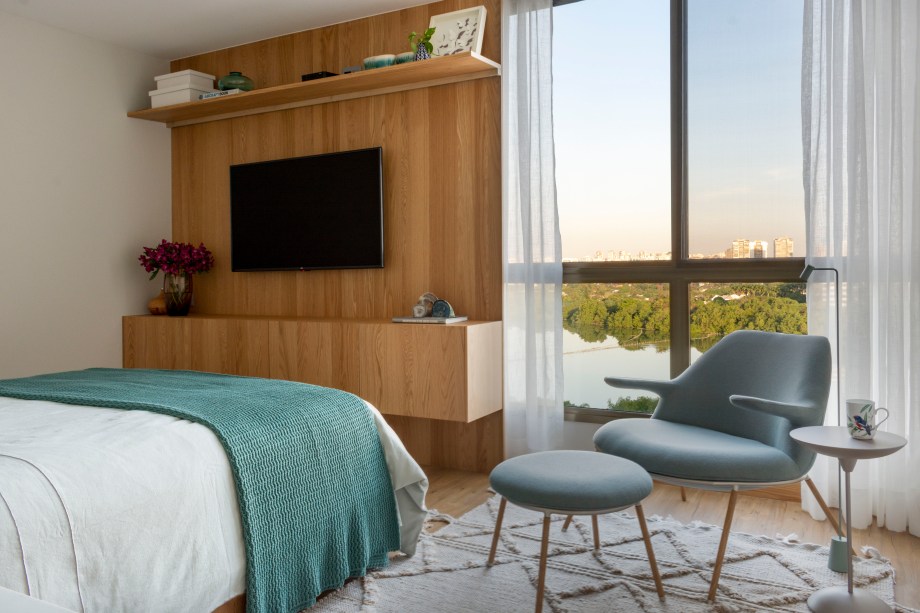 No quarto do casal, a posição da cama voltada para a janela garantiu a plena vista da paisagem externa a partir dela e deu mais privacidade aos clientes, já que o vizinho não consegue vê-los da varanda. No décor, a combinação de carvalho natural, azul e verde sálvia (presente nas luminárias, roupa de cama e estofamento da poltrona) deixou o ambiente mais suave e acolhedor.