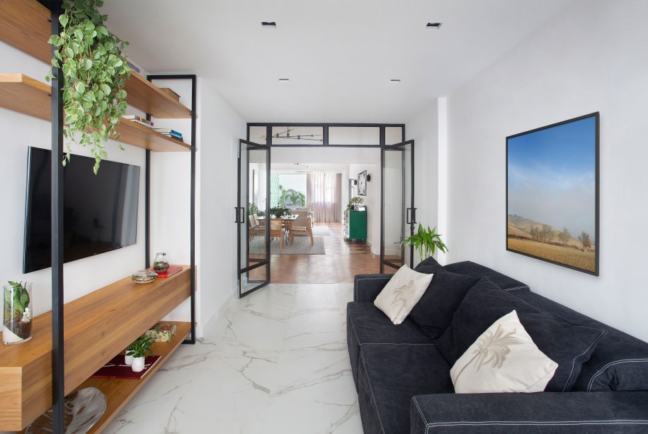 “A integração transformou completamente a experiência de estar no apartamento. Ele parece muito maior”, descreve a arquiteta. A sensação de espaço único é valorizada pelas portas de vidro, que também limitam o uso do ar-condicionado em algumas situações.