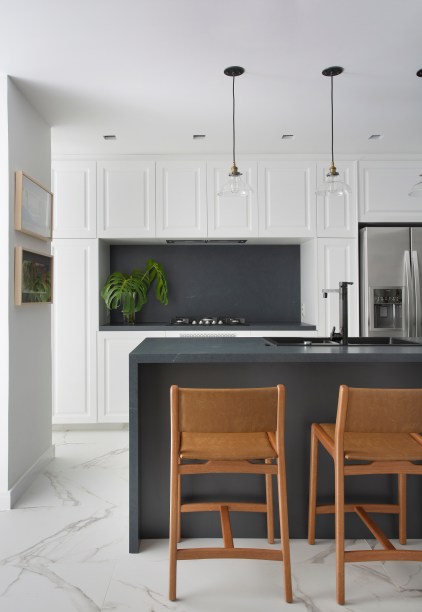 Entre essas escolhas, a cor branca foi fundamental para ampliar a iluminação natural que as aberturas geraram, além de deixar que outros elementos ficassem em destaque. É o caso dos detalhes em preto e cinza na esquadria das portas de vidro e nas bancadas em dekton da cozinha, que conferem contemporaneidade ao projeto.