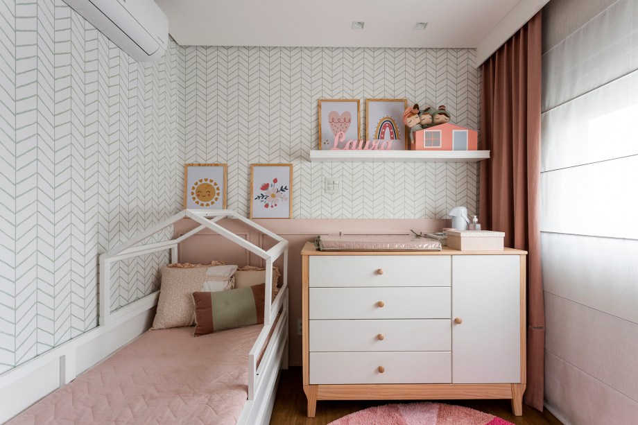 No quarto da filha de 5 anos que ama rosa, as candy colors compõem com a palha e os tecidos. O papel de parede florido cria um clima lúdico, assim como a mesa de vidro que expõe lacinhos.