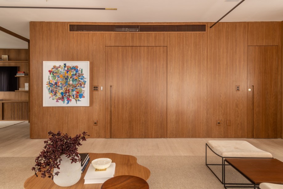 O hall de entrada recebeu uma grande porta pivotante que se abre para revelar uma marcenaria imponente em lâmina Cabreúva natural. Essa marcenaria também serve como uma parede/galeria para futuras aquisições artísticas.