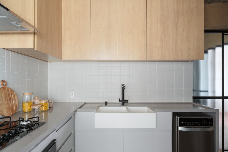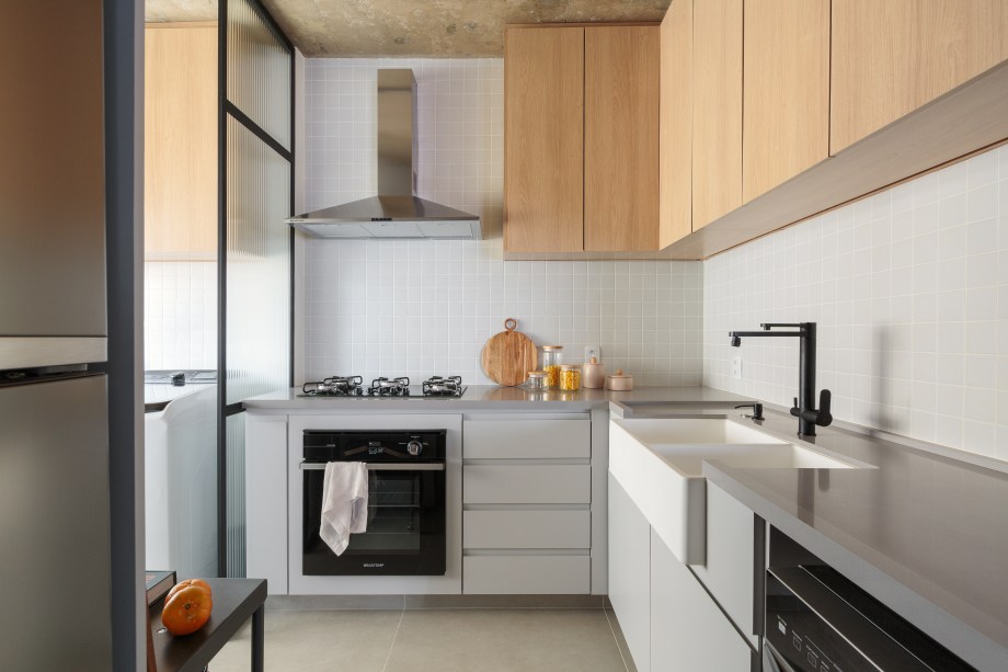 A integração entre cozinha e sala foi alcançada pela eliminação da viga entre os ambientes, enquanto a exposição da laje na cozinha adicionou uma atmosfera contemporânea. Detalhes funcionais, como portas em serralheria para fechar o espaço de trabalho na sala e a valorização da lavanderia, destacam-se como elementos distintivos do projeto.