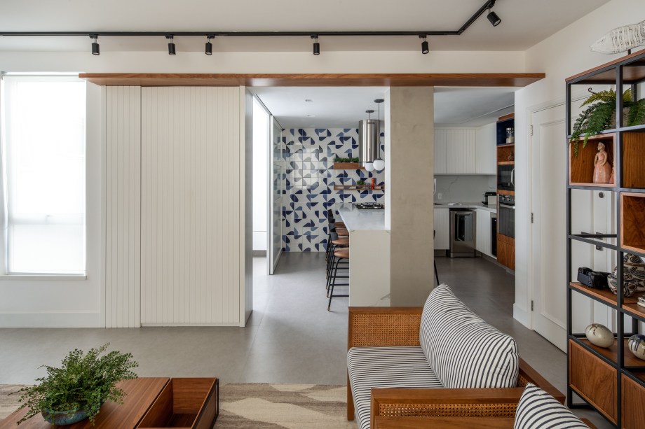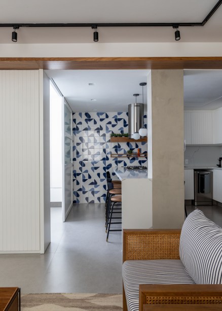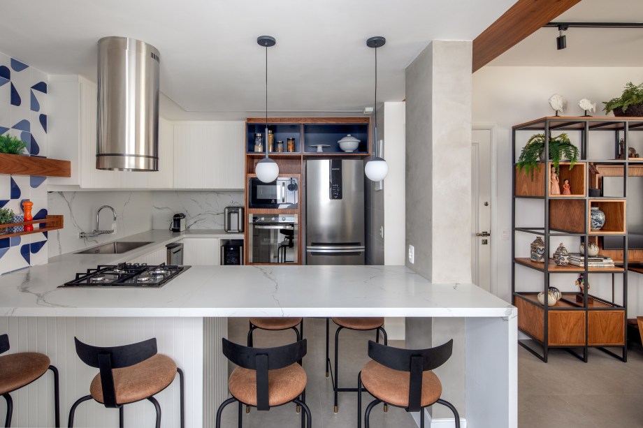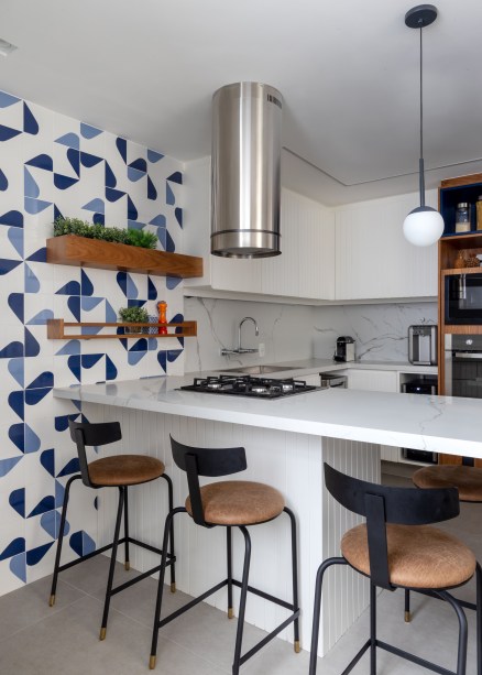 Apê de 90m² cheio de bossa tem cozinha integrada com azulejos azuis