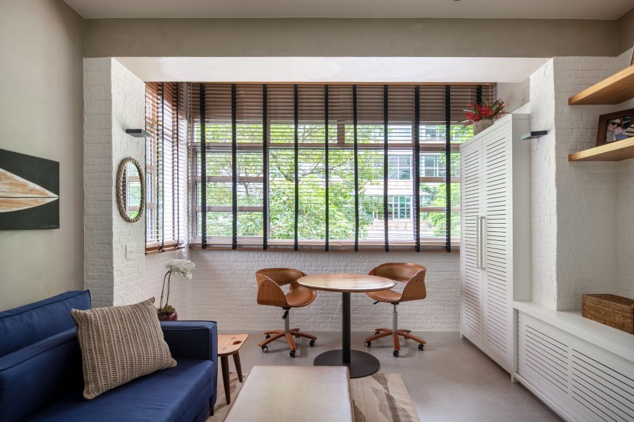 Dentre os outros revestimentos, destacam-se o porcelanato no piso e os tijolinhos brancos na parede da varanda, que conferem uma textura ao espaço.