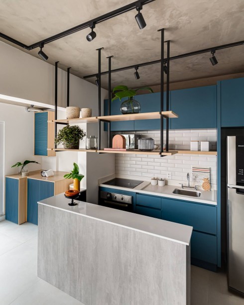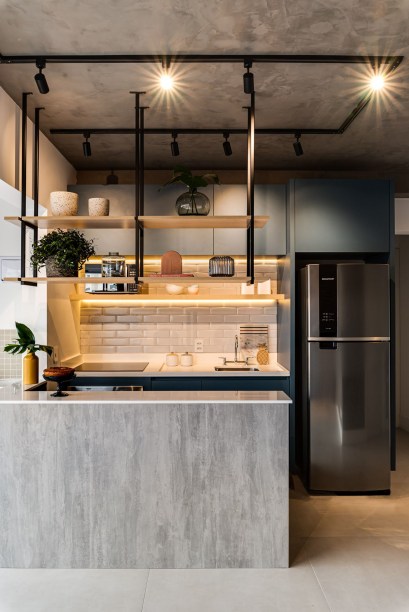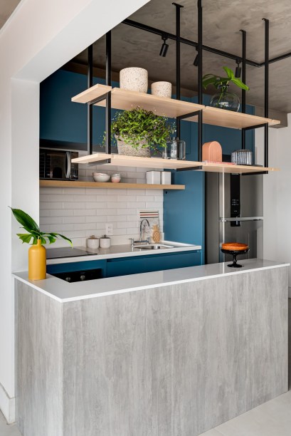Apê compacto de 44m² tem inspiração nos lofts industriais e cozinha azul