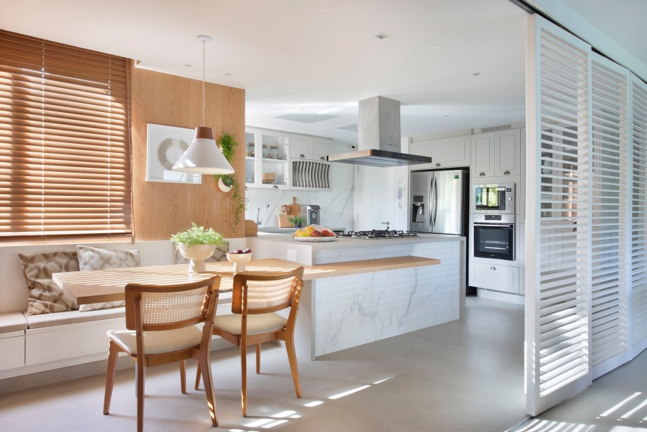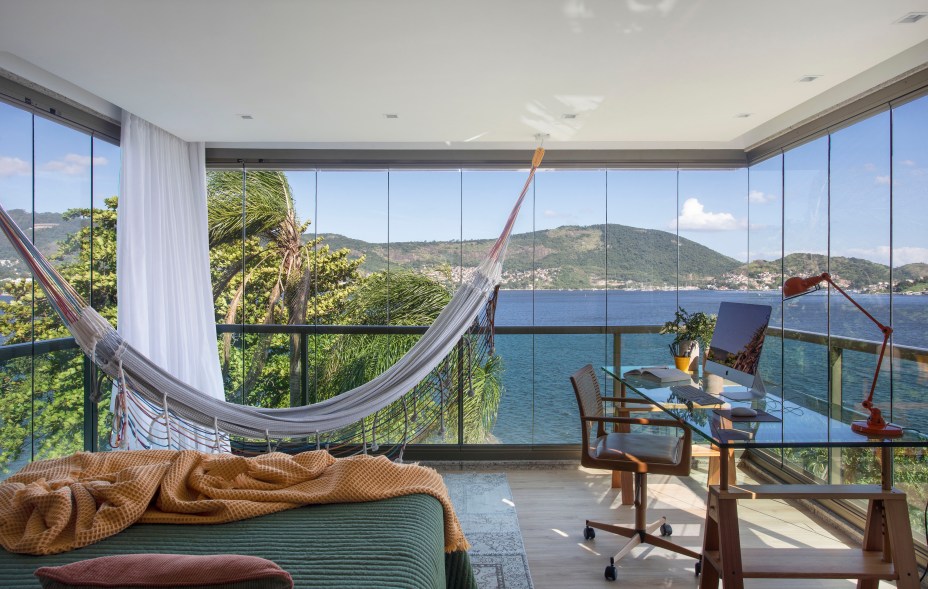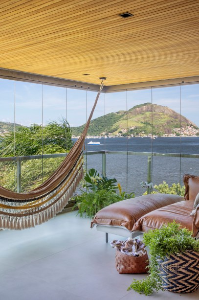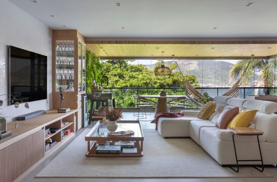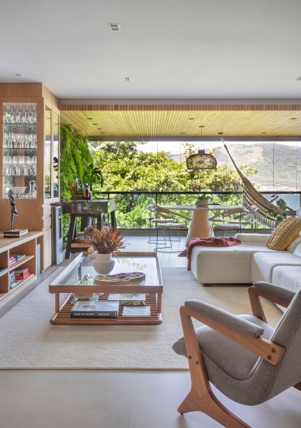 Apê de 220m² tem área gourmet, rede na sala e quarto com varanda integrada