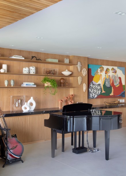 No novo layout, o piano ganhou lugar de destaque na área social, tornando-se um elemento chave no projeto. Na suíte do casal, a arquiteta promoveu a integração do dormitório com a varanda para valorizar ainda mais a vista, posicionando a cama de frente para o mar.